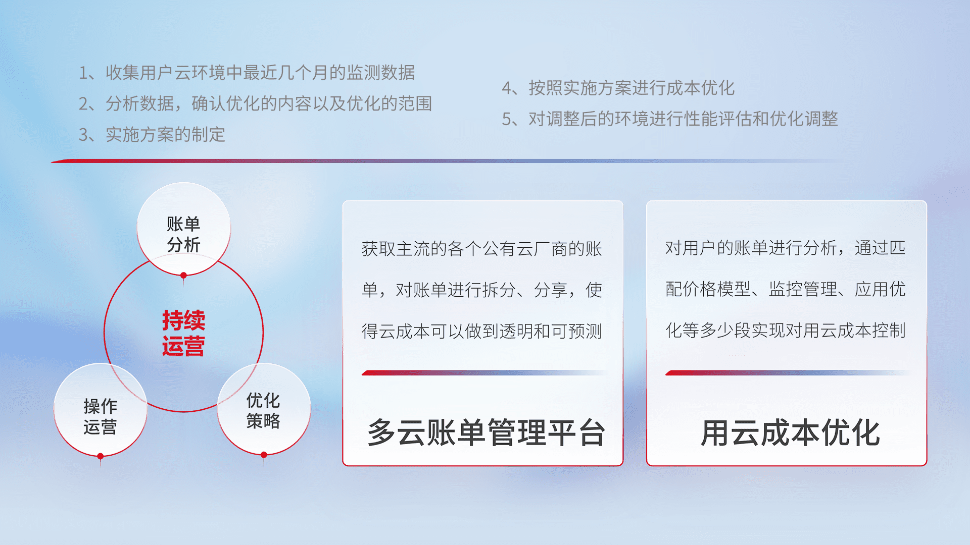 通过多云纳管,,,以统一的资源数据模型把客户的云资源进行抽象和封装,,进而实现对多云资源的统一操作,,,保障云资源管理的可靠性、、稳定性与可用性。。量身定制化运维内容,,,配置、、、、开发运维、、、、补丁管理、、、、备份、、、监控、、认证和访问管理、、、审计和日常巡检等,,,保障在用云过程中的可靠度,,,稳定度以及高可用率。。